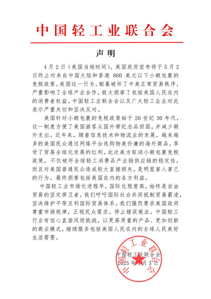 4月2日(美国当地时间),美国政府宣布将于5月2日终止对来自中国大陆和香港800美元以下小额包裹的免税政策。美国这一行为,粗暴破坏了中美正常贸易秩序,严重影响了全球产业合作,极大损害了包括美国人民在内的消费者权益。中国轻工业联合会以及广大轻工企业对此表示严重关切和坚决反对。